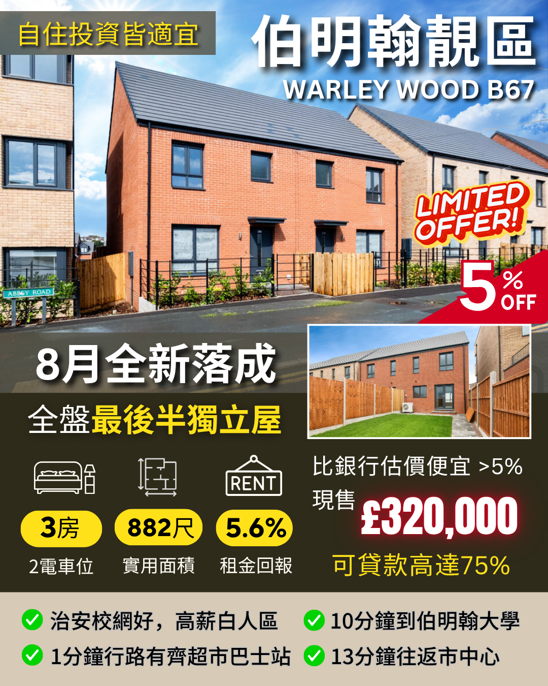 机会回流,伯明翰大学周边优质捡漏好盘,最后一套全新半独立屋,机会难得!